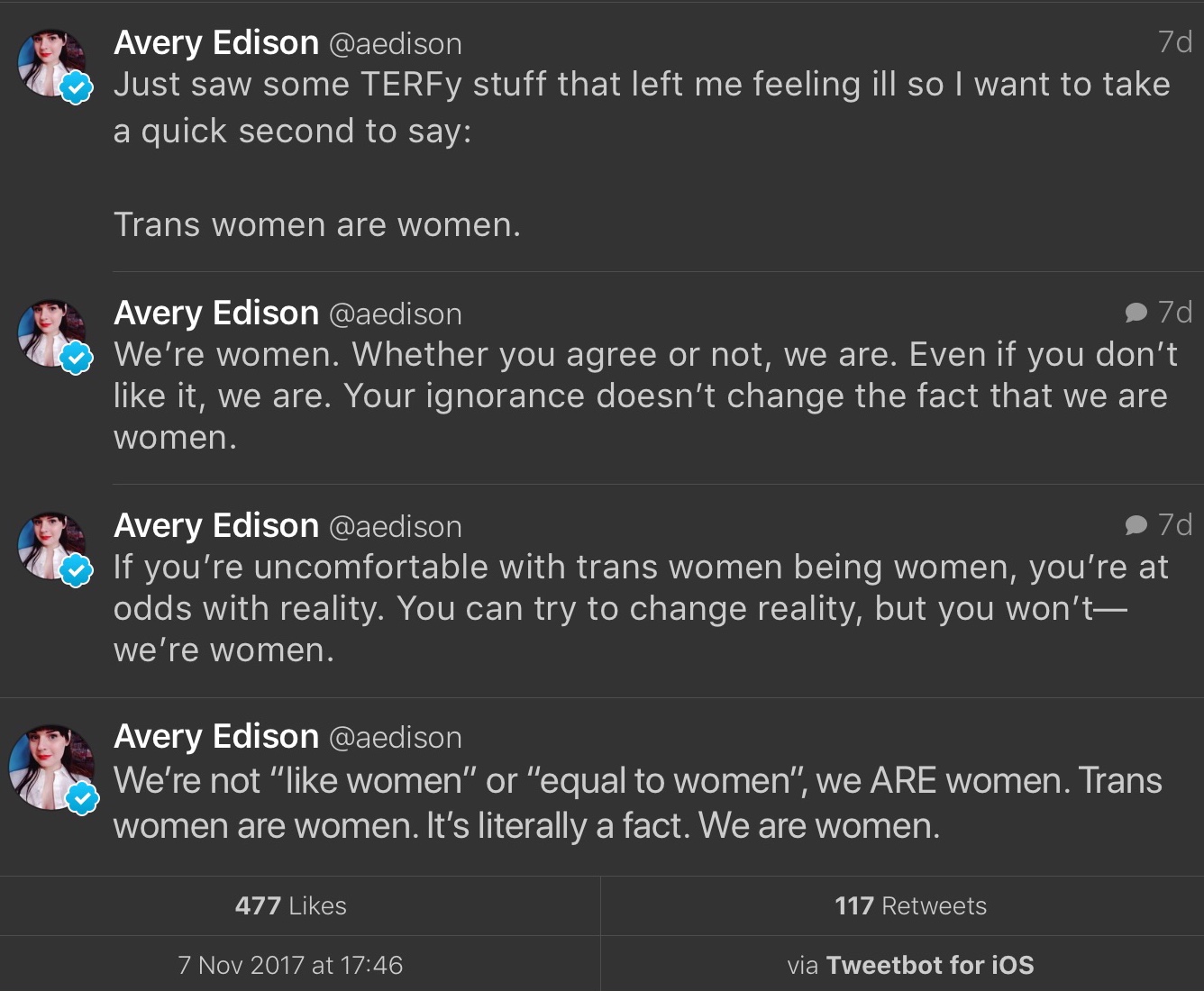 Women are being put in an unfair position by males who are claiming to be women despite having benefitted from living a good proportion of their lives as men. There is not just an absense of commonality of experience, there is an absense of reality and, ironically, empathy; for men who seek to become what they love, they sure don’t give two fucks about women. This ideology is being used to attack women and instrumentalise women against each other. What more evidence does anyone need to how malignant the men’s sexual rights activism of transgenderism is?