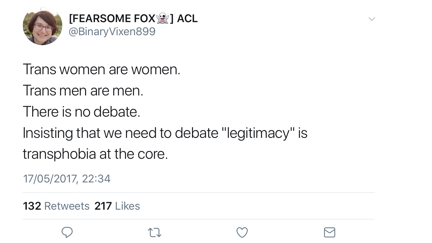 I fully support trans people’s rights and will fight for and would love to see an end to violence and discrimination against them, but I am very tired of the misogynist indefensible dogma that “trans women are women” (ie have the right to lay claim to the entire lived experience and identity of bio born women.)