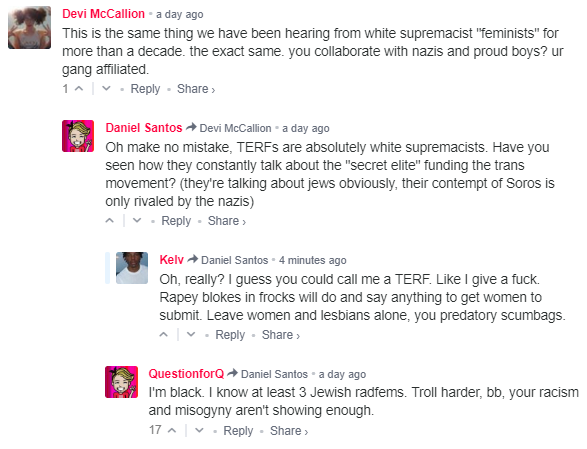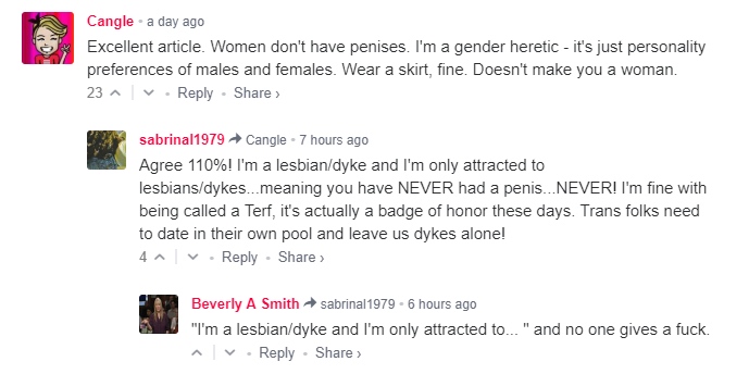 As comically ridiculous as it may seem of Zinnia Jones to be talking about his ‘girl dick’ or Riley Dennis suggesting it is ‘cissexist’ to be attracted to people with only one type of genital or that your dating preferences are an act of hate, or Roz Kaveney claiming that ‘trans women’s penises are not male penises’, don’t be fooled by the deep-rooted homophobia which lies at the heart of what these men are trying to do, which is to make it unacceptable for women to be able to set their own intimate and sexual boundaries. There is of course nothing new with heterosexual males trying to do this, the difference is this is being done under the flag of social progressivism and civil rights.