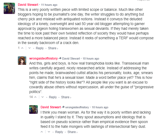 It’s a measure of how completely topsy-turvy the transgender debate has made LGB&T politics and organizations that the person writing this piece is a transsexual. I am, however, uniquely placed to be able to write this piece as I am a man who ‘lives as a woman,’ whatever that may mean, and can see exactly how too many transgender rights activists think. And as anyone who has ever participated in social media knows, any criticism of transgender ideology, which we all of us have the right to accept, critique and reject, any deviation from the brain-sucking mantra of ‘trans women are women,’ is met with reports to our employers, threats of physical violence, and threats of rape and death. This is a viciously toxic form of men’s sexual rights activism that has managed to rebrand and reframe itself as a civil rights movement.