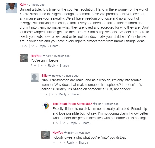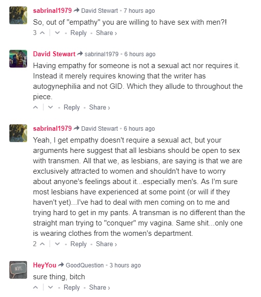 Any suggestion this is aimed at men as well as women is disingenuous: Autostraddle and Everyday Feminism (which syndicated the piece) are websites targeting women, and of course the author of the piece is himself sexually oriented towards women. Thus, it is the intent of the piece to argue against any objection a woman may have to dating a member of the opposite sex. Think about what this means: five years ago, women’s online magazines were arguing that lesbians submit their bodies to men who claim to identify as women. (An excellent example of the gaslighting and outright manipulation used by activists at this time is transposed in the Femonade piece ‘The Cotton Ceiling? Really?’.