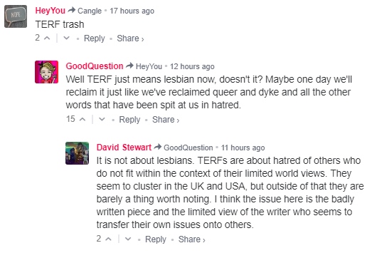 Diva’s Linda Riley is unwilling to enter into any discussion with actual female homosexuals over whether men can call themselves lesbians, instead doubling-down by reframing even questioning her wish to validate heterosexual males as lesbians as nothing other than the incitement of hate: