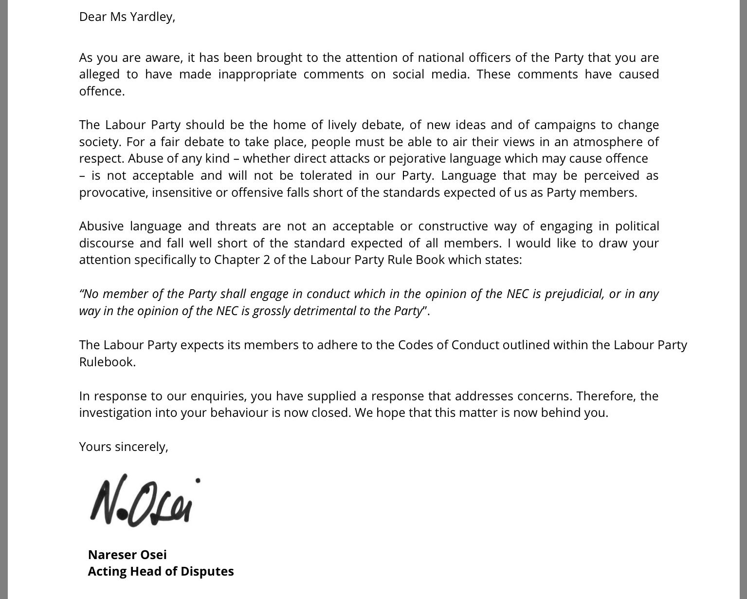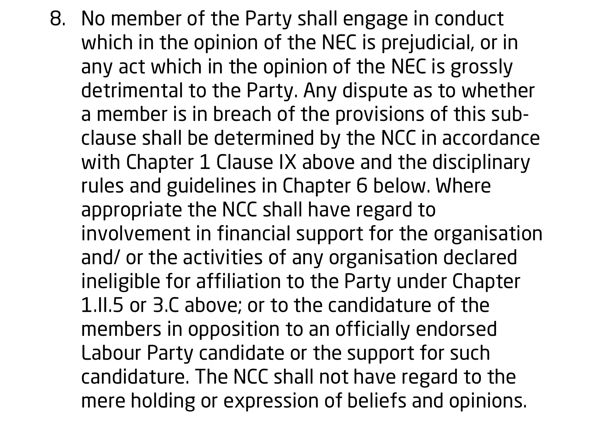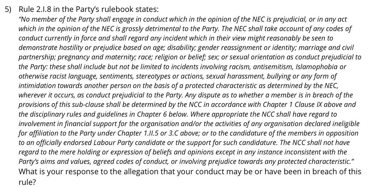 Please explain in what way you believe my tweets contravene rule 2.1.8 of the Party’s rulebook.
