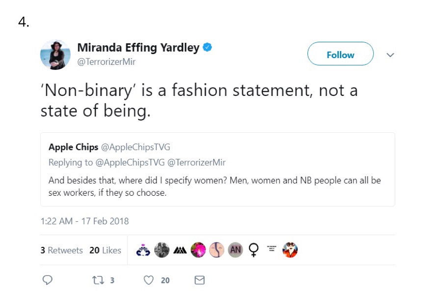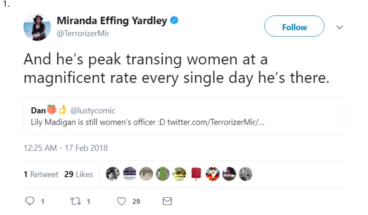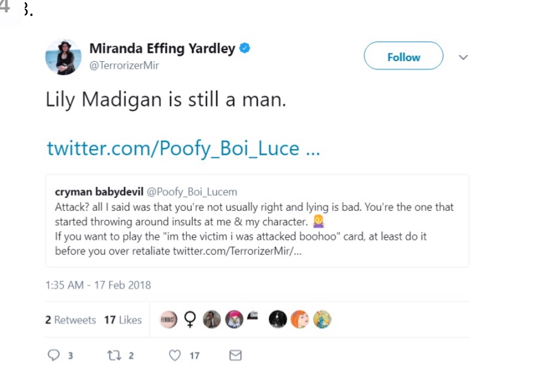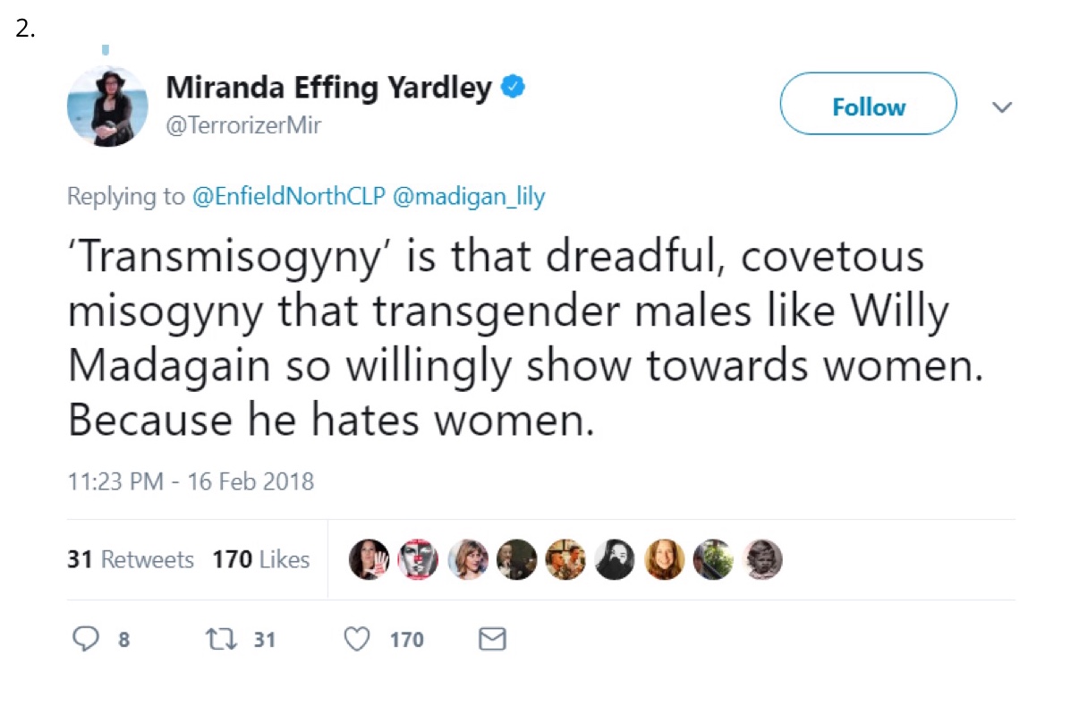 The word ‘misogyny’ has been appropriated by transgender activists to claim ‘transmisogyny’ as ‘the intersection of transphobia and misogyny’. However, ‘trans women’ are male and not subject to misogyny. Ironically, some of the most obvious perpetrators of misogyny today are transgender activists themselves, who seek to redefine women into nonexistence and claim womanhood by the appropriation of cultural signifiers. Likewise, these activists have appropriated violence carried out against a high-risk population of minority-ethnic transsexuals in order to falsely claim victimhood and push a political agenda that cannot stand honest scrutiny. It is violent homophobic men who threaten transsexuals, not women and certainly not feminists. A more appropriate definition of transmisogyny would centre on it being used to identify the cultural misogyny of transgender males, like the individual identified in this tweet and the tweet above. The quotes here show Madigan using the misogynistic slur ‘TERF’, and more generally, demonstrate Madigan’s full participation in the misogynist online trans activist community.
