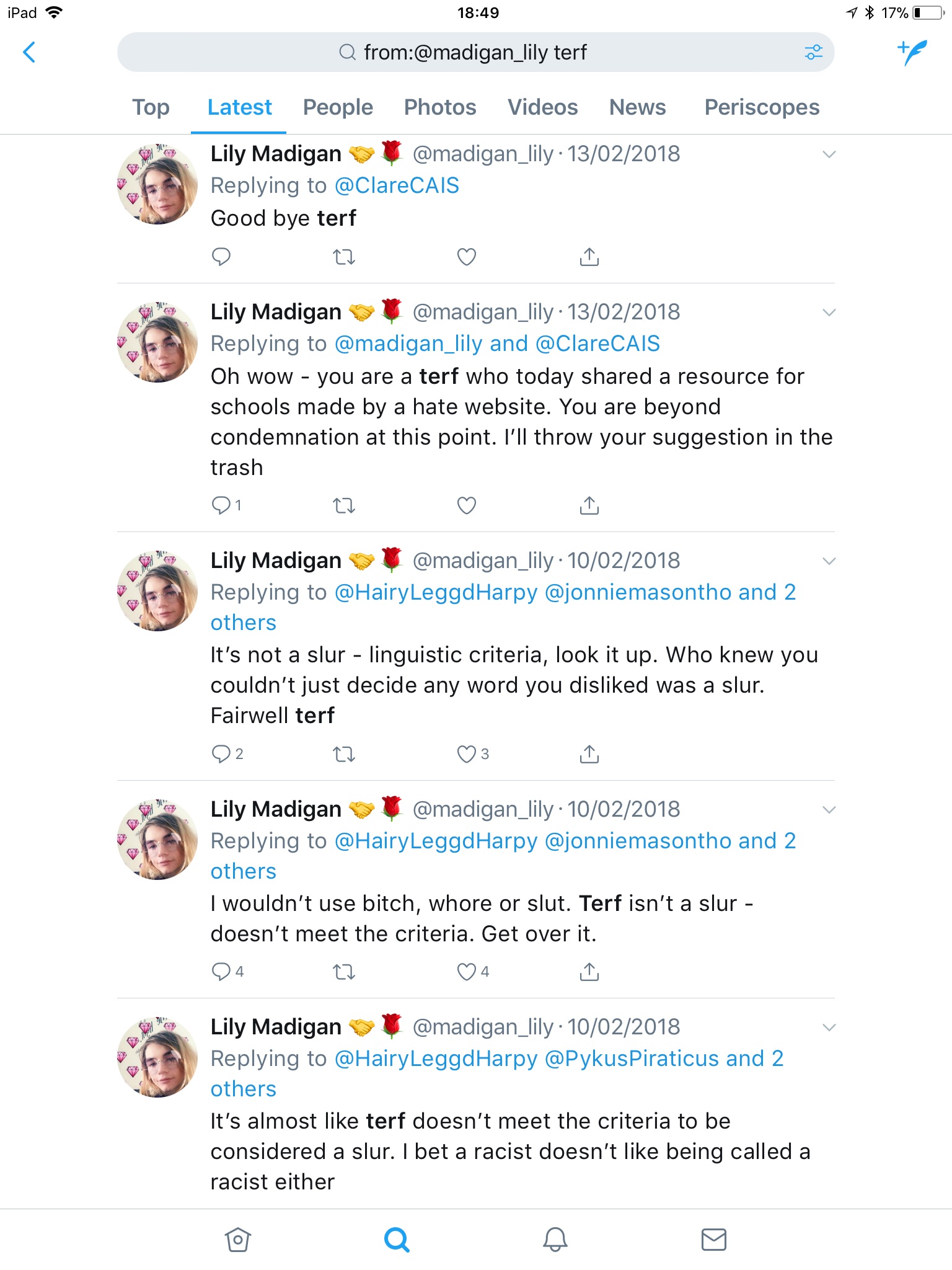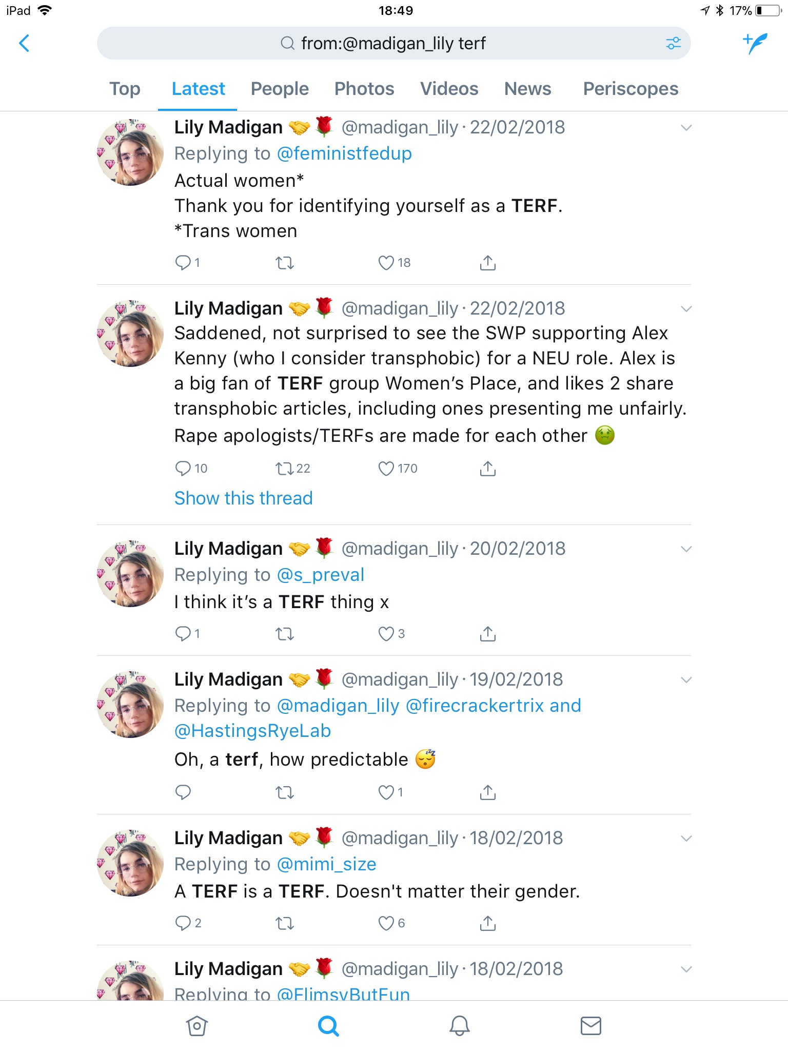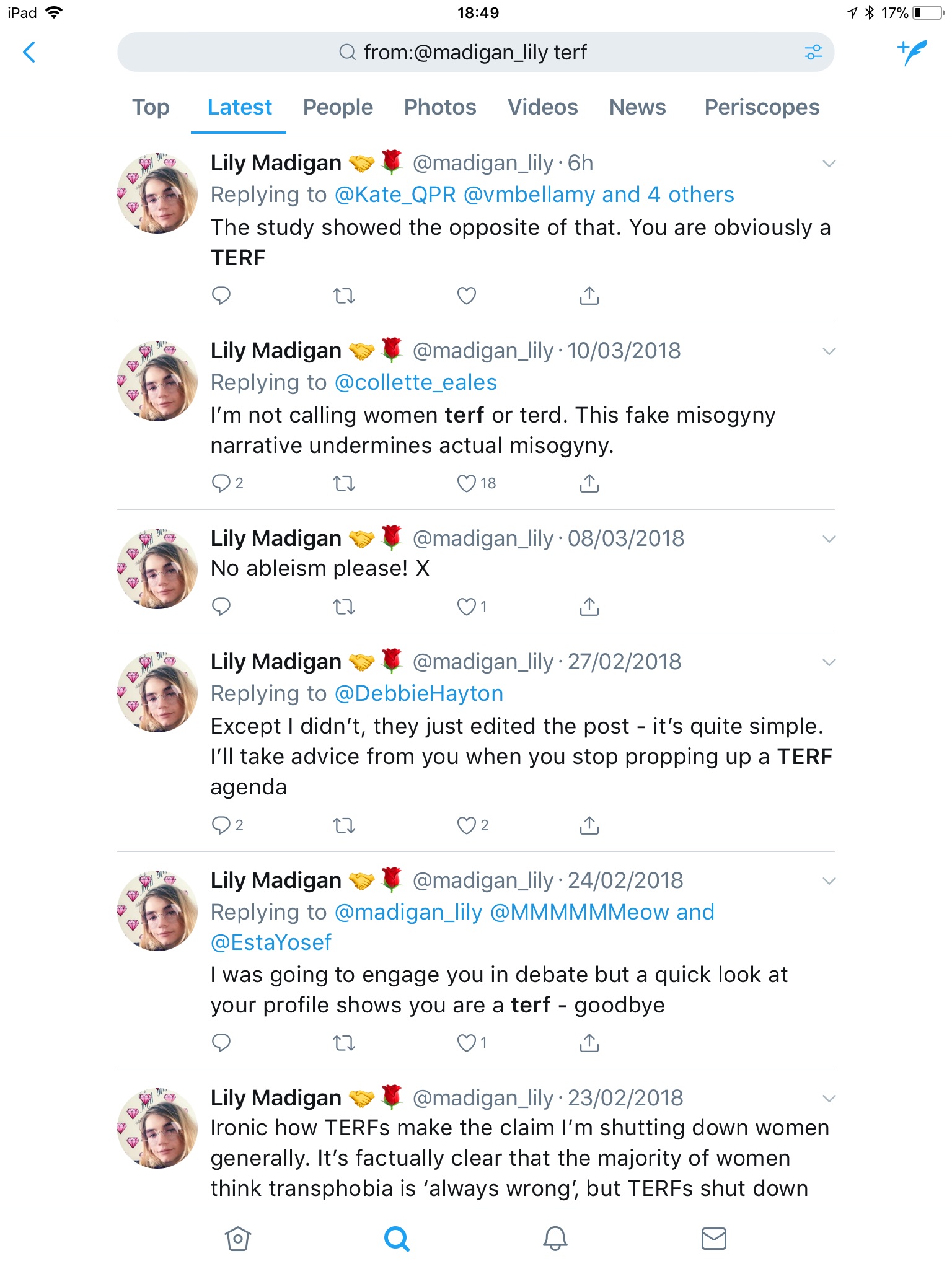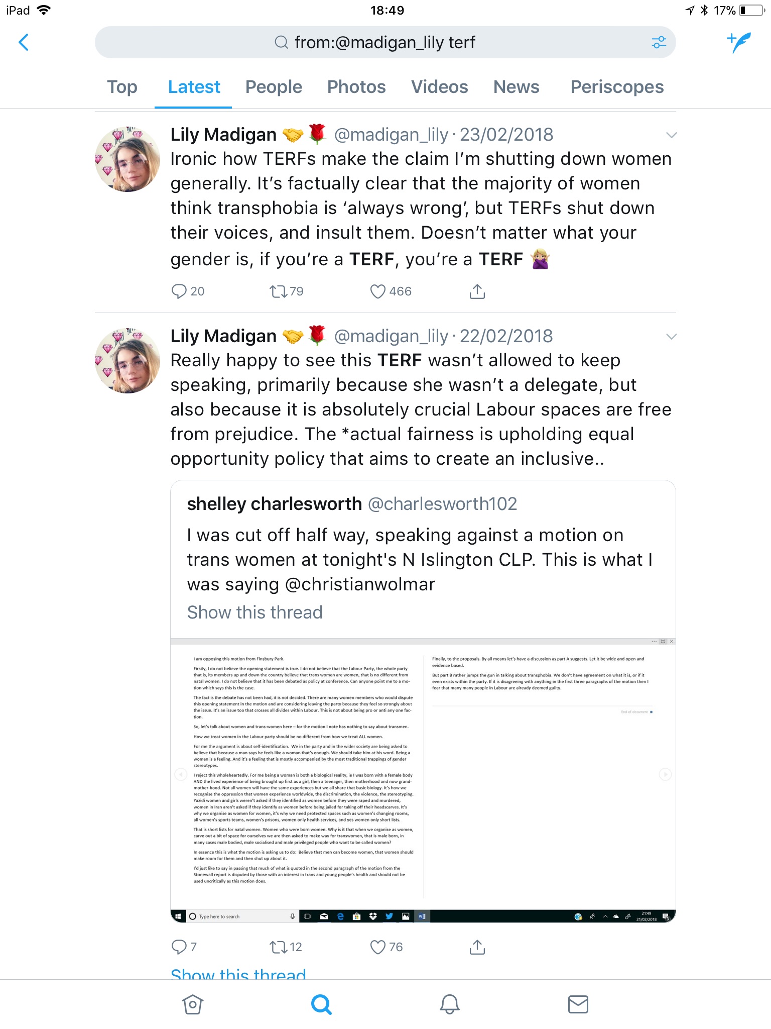 In the context of the Labour Party this would include such self-described transgender males taking places as Women’s Office in CLPs, taking advantage of all-women shortlists and occupying places on the Jo Cox Leadership program. Apropos Lily Madigan, it should be obvious the presence of a twenty year old misogynist male as women’s officer is inflammatory. I have attached several pages of tweets from Madigan where he described women as ‘TERF’; this is a homophobic, misogynistic and dehumanising slur against women, which has been already used to incite violence against women – as in the Speaker’s Corner assault and the recent picket-line threats against BECTU senior executive committee member Paula Lamont.
