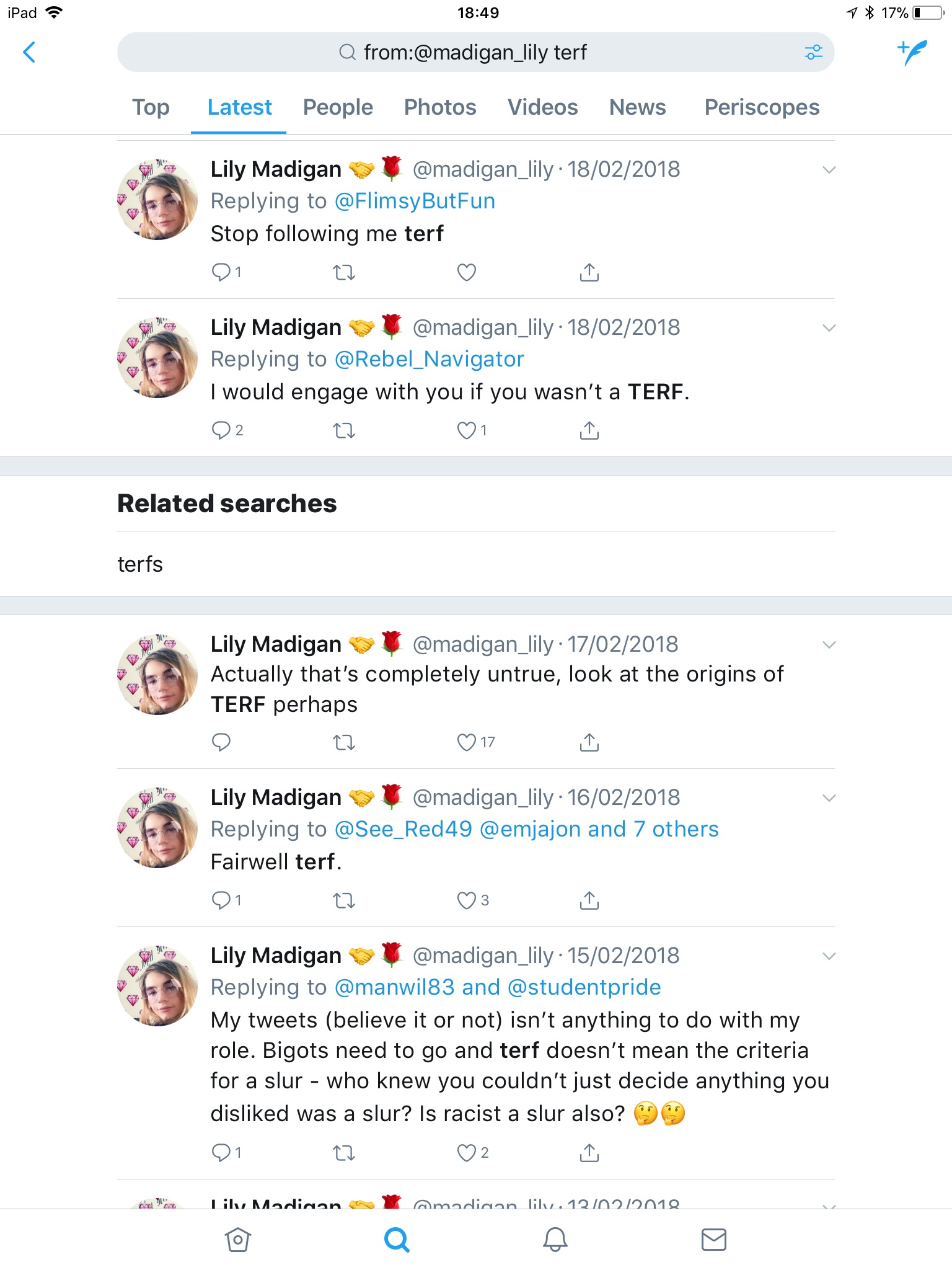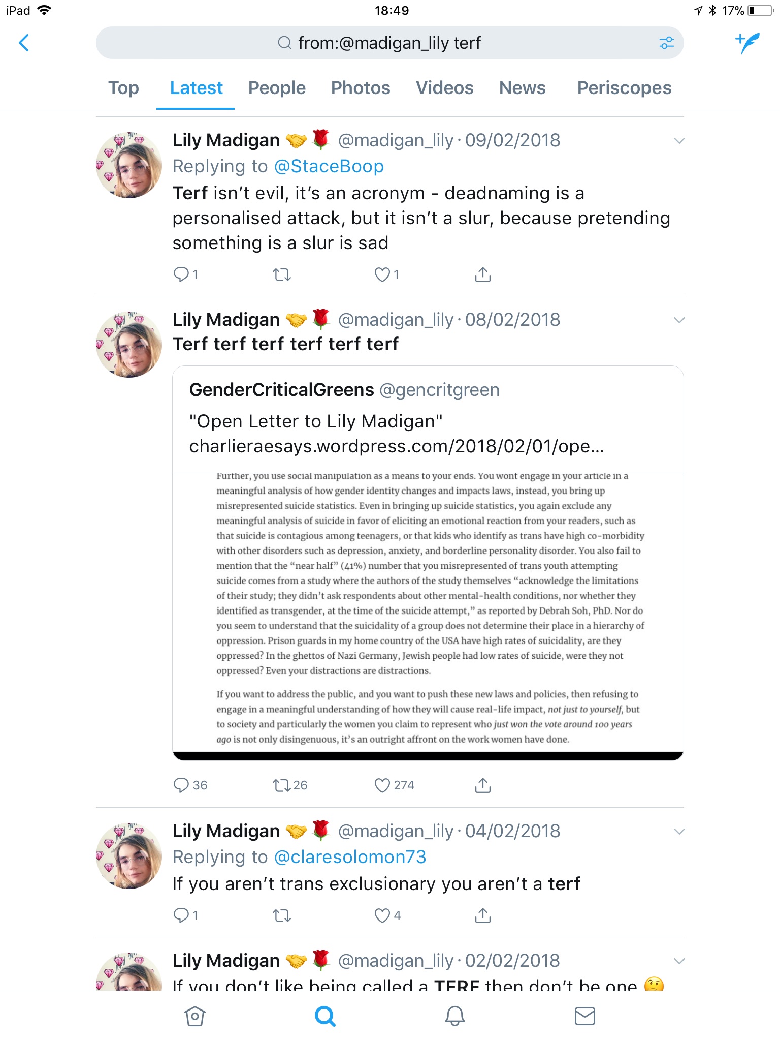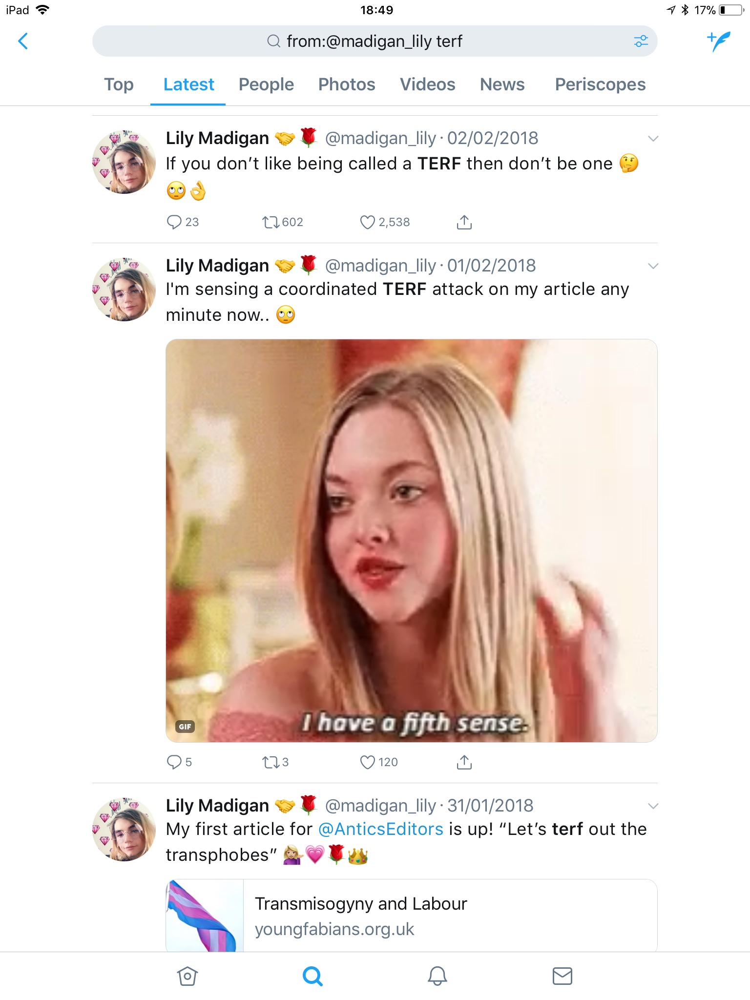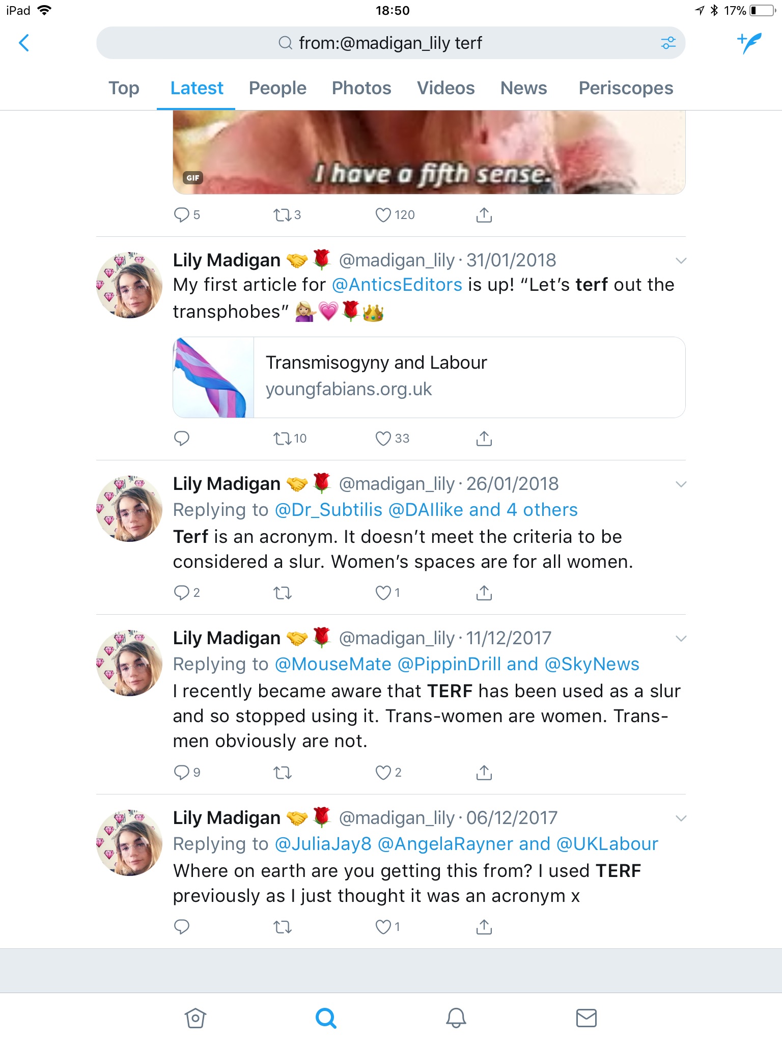 In the context of the Labour Party this would include such self-described transgender males taking places as Women’s Office in CLPs, taking advantage of all-women shortlists and occupying places on the Jo Cox Leadership program. Apropos Lily Madigan, it should be obvious the presence of a twenty year old misogynist male as women’s officer is inflammatory. I have attached several pages of tweets from Madigan where he described women as ‘TERF’; this is a homophobic, misogynistic and dehumanising slur against women, which has been already used to incite violence against women – as in the Speaker’s Corner assault and the recent picket-line threats against BECTU senior executive committee member Paula Lamont.