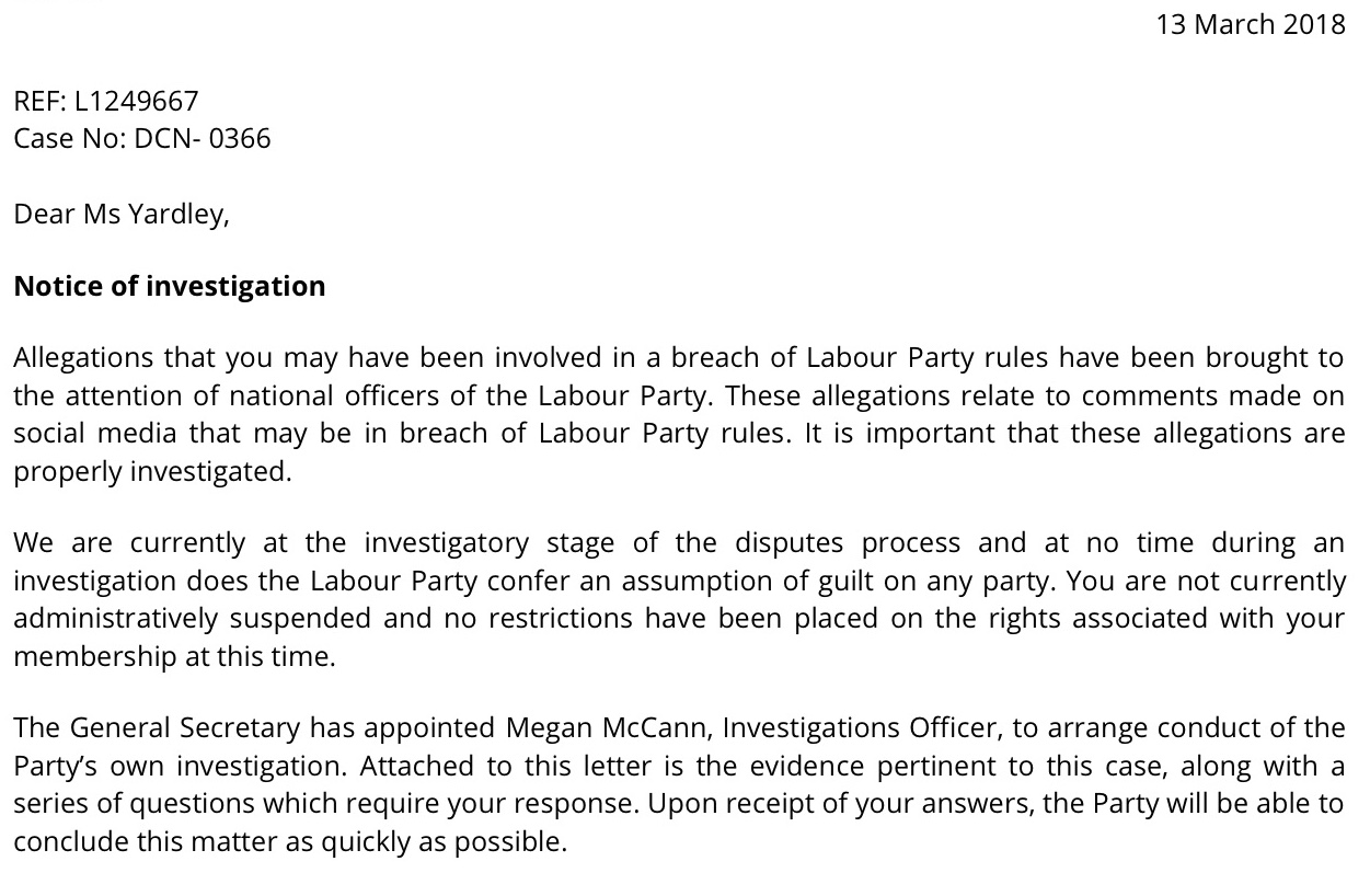 On 13 March I received by email details of an investigation into complaints made against me to the Labour Party. Here follows the complaint and my response which was emailed the week after. As at today’s date, 7 April, I have had no response. There was a piece published on this in The Times today.