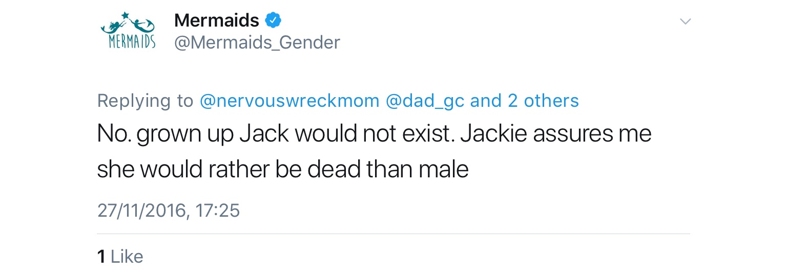 Of course, Mermaids is the darling charity of the autogynephiles who have absolutely fuck all in common with these children, as Ray Blanchard explained to me last year: