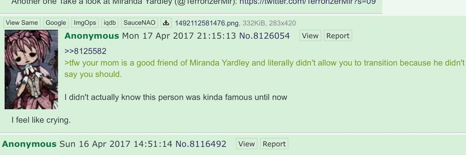 “tfw (‘that feeling when’) your mom is a close friend of Miranda Yardley and literally didn’t allow you to transition because he didn’t say you should”