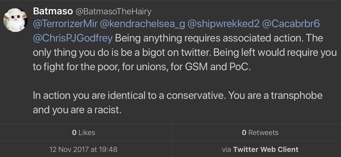 I’ve had a number of transgender males suggest to me that I ‘feel proud’ for the ‘psychotic behaviour’ of making a kid cry (I didn’t, that statement was made by someone commenting on this original post) and that I was ‘bragging about preventing some trans kid from transitioning’.