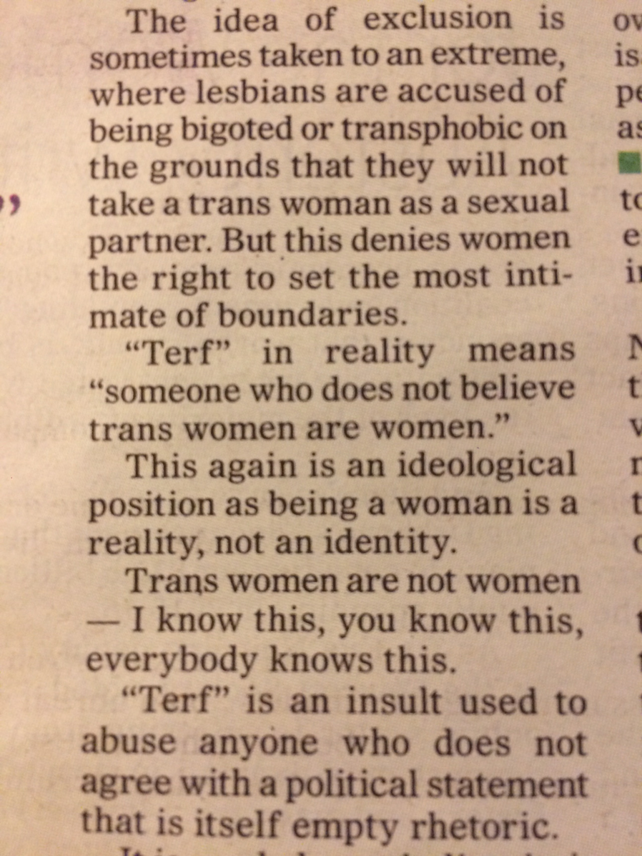 ‘TERF’ is a pejorative used to shut women up, and it is wrong to accuse women of being bigots for not accepting transwomen as sexual partners, it’s the 21st century for god’s sake. This is from my Morning Star piece of 24 December (today as I type this).