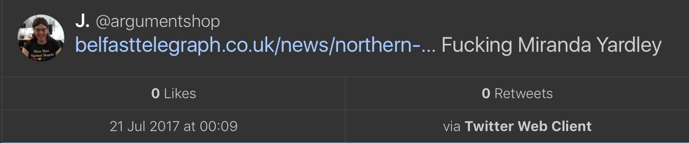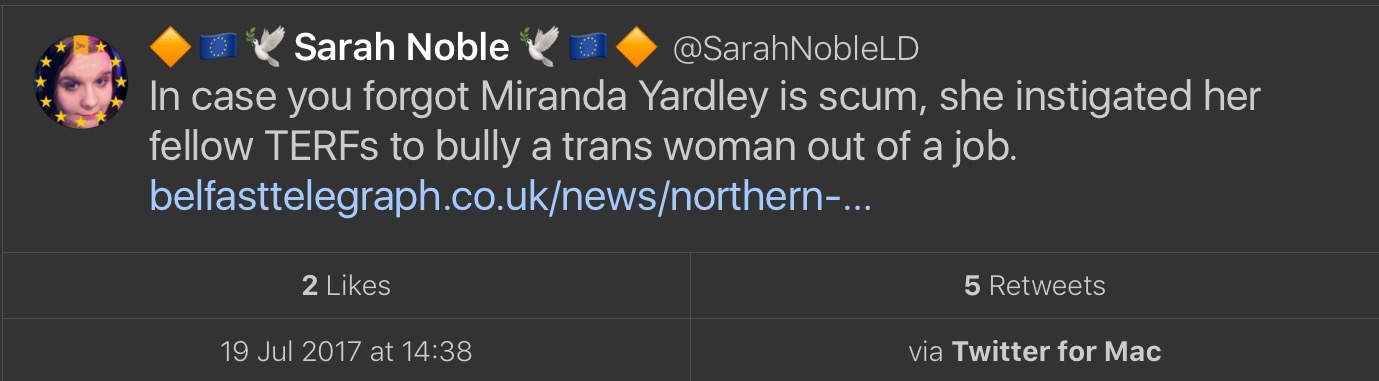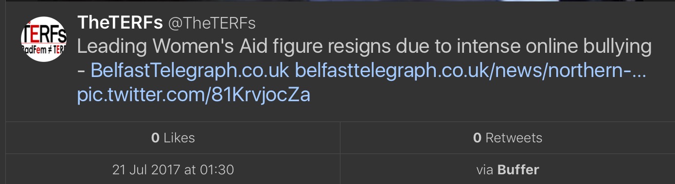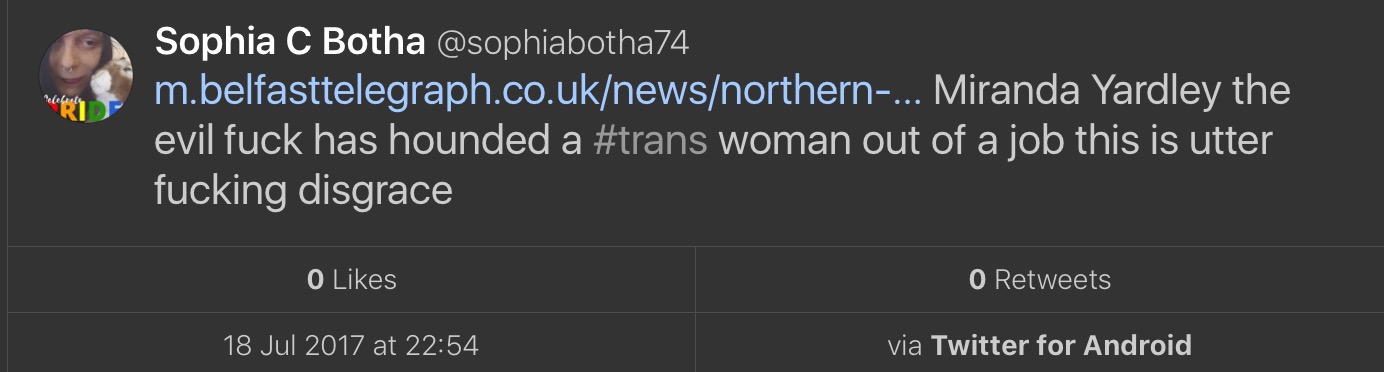 (I) As reported here in the Belfast Telegraph, Perry apparently voluntarily left this role late May/early June blaming me(!) and attacks by ‘extreme feminists’. Bullying is never acceptable and I do not condone it. There are, however, as highlighted above, valid criticisms of Perry’s appointment to this role and I stand by my criticism. Ironically it’s an abuse of power the Belfast Telegraph naming me in the way they did and it’s misleading journalism to omit the fact that the person making such criticism is themselves transsexual.