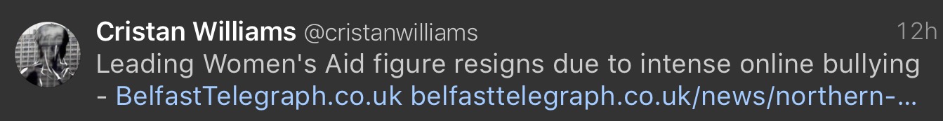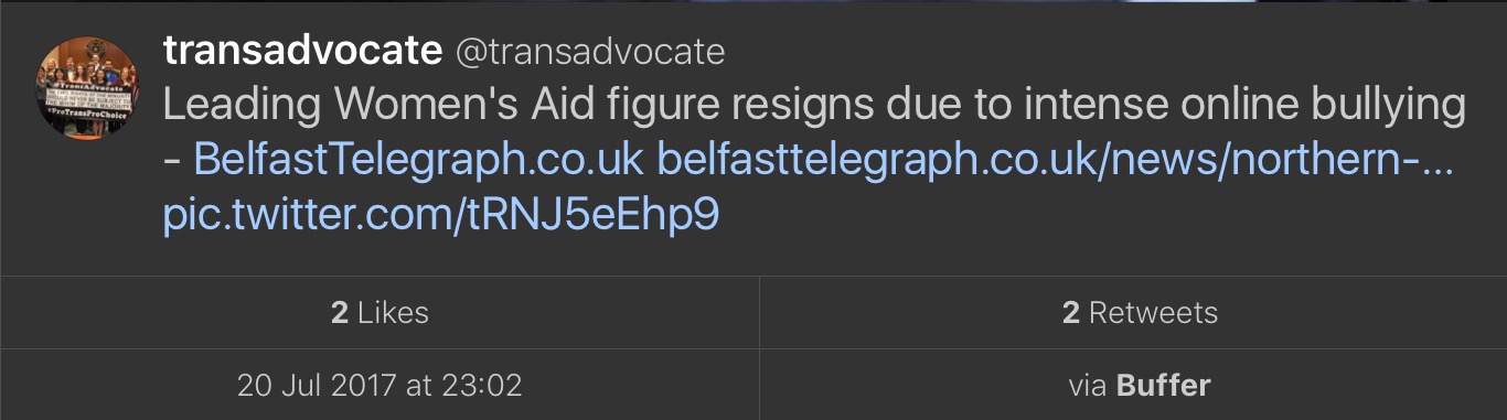 “Women’s Aid Federation Northern Ireland’s Twitter page was targeted by anti-trans commentators, who reported an inaccurate story of our appointment of a trans Director to our Board.”