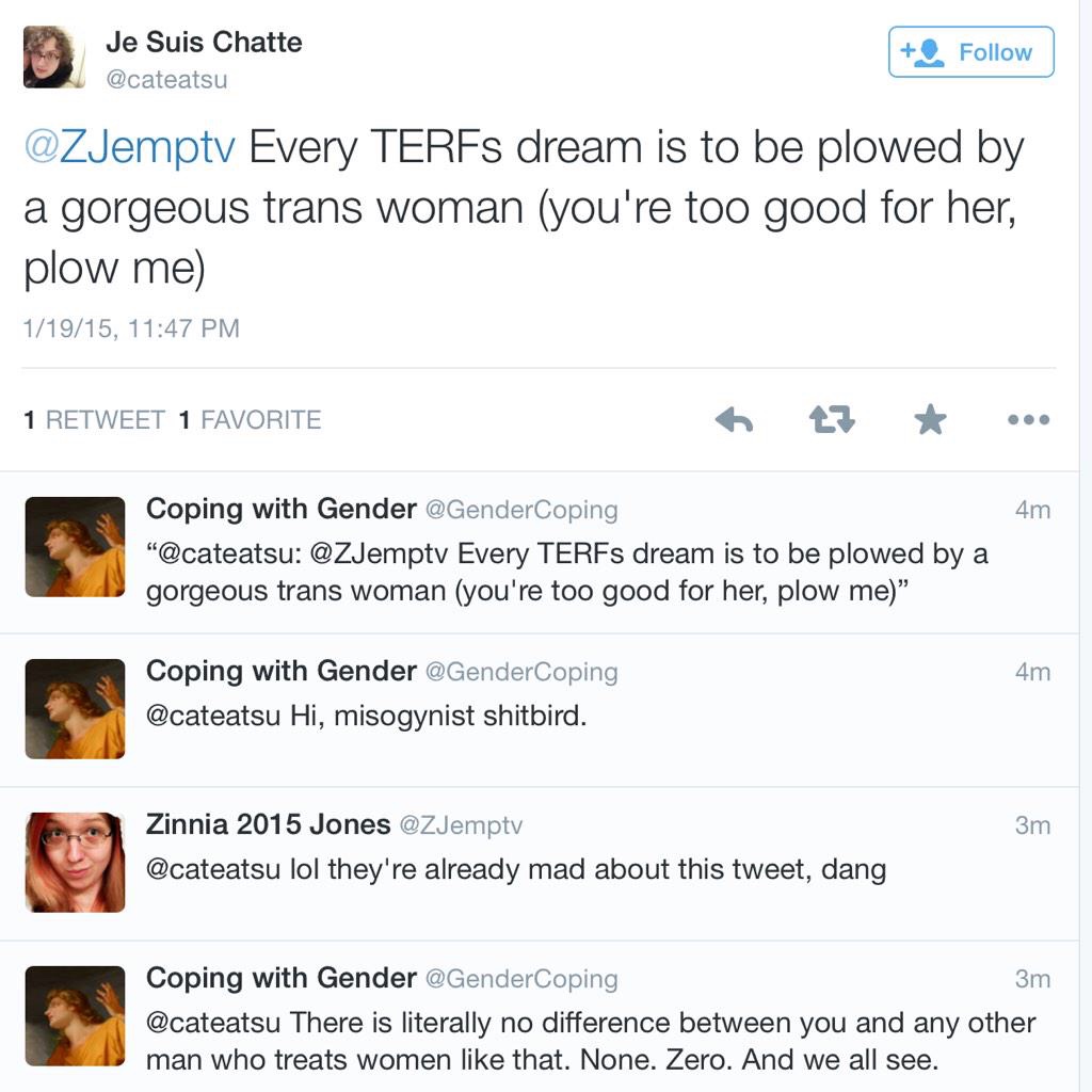 Uncategorised Posted on 20th January 201527th February 2015 by miranda Transgenderist neverserve @cateatsu propagating rape culture. Share this:TwitterFacebookTumblrRedditPinterestWhatsAppLike this:Like Loading... Related