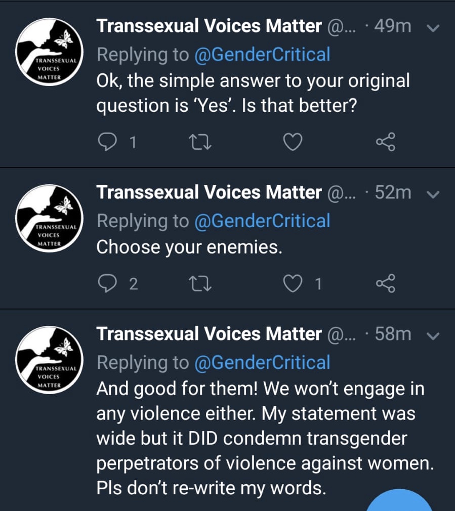 They are revising their statement in the light of your’s and others’ criticisms from what I see on Twitter. I really hope you will be able to support the revised version. Everyone has been saying for years that TRAs don’t represent a lot of ordinary transgender/transsexual people, and if there is a chance that a significant number of these would speak out, it would be a pity if they changed their minds due to what they perceive as an attack and went back to the arms of the TRAs.