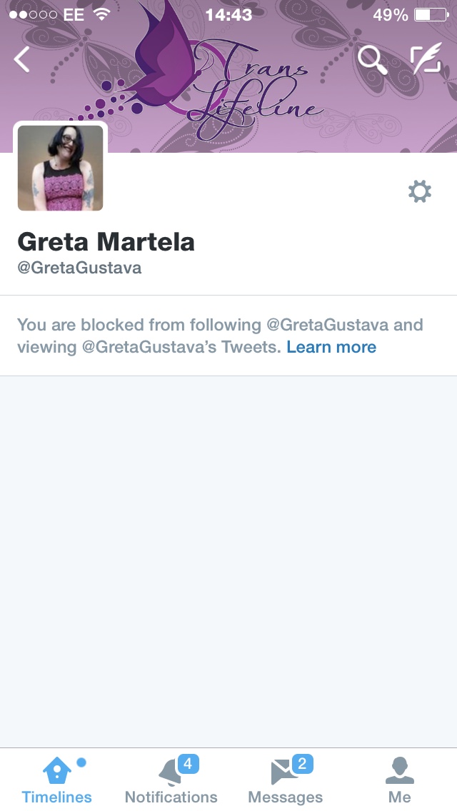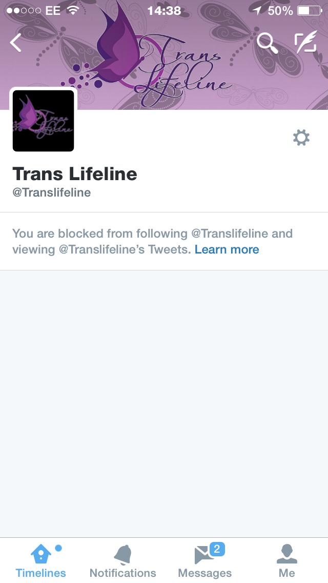 Update to my piece about translifeline they have now blocked me on Twitter after I freely offered to help. http://ommadusk.tumblr.com/post/108274894322/the-trouble-with-trans-2-one-step-forward-two