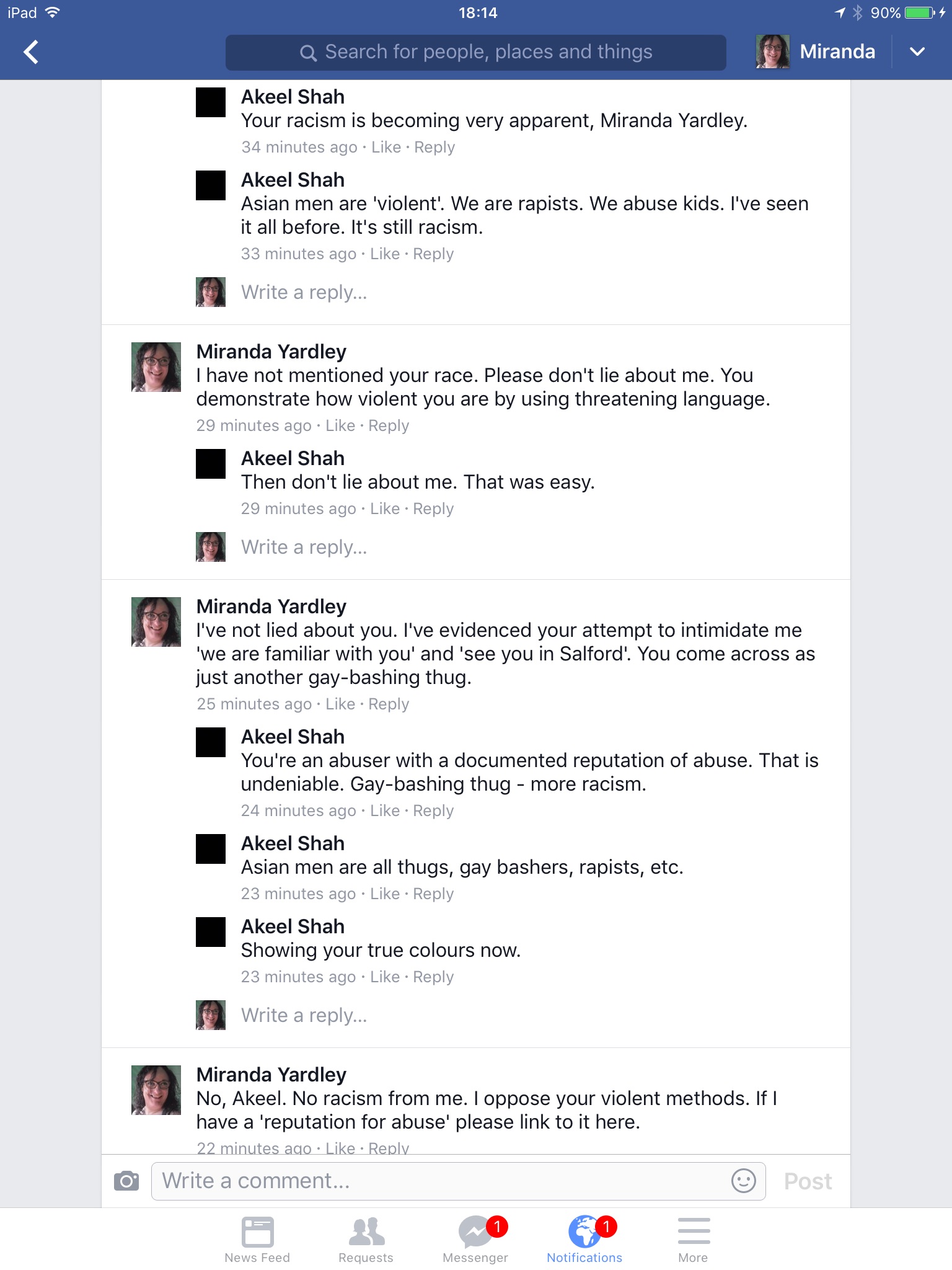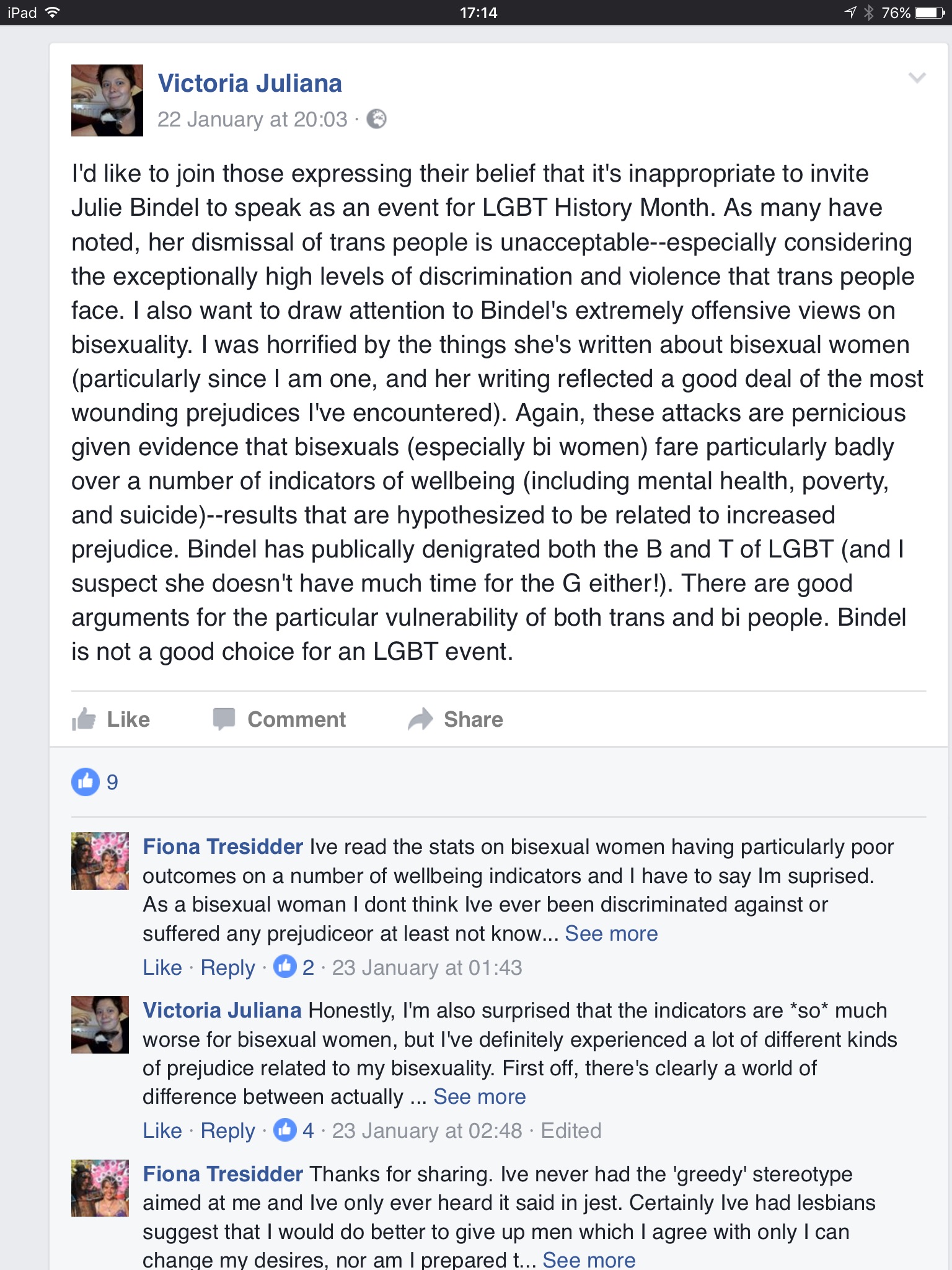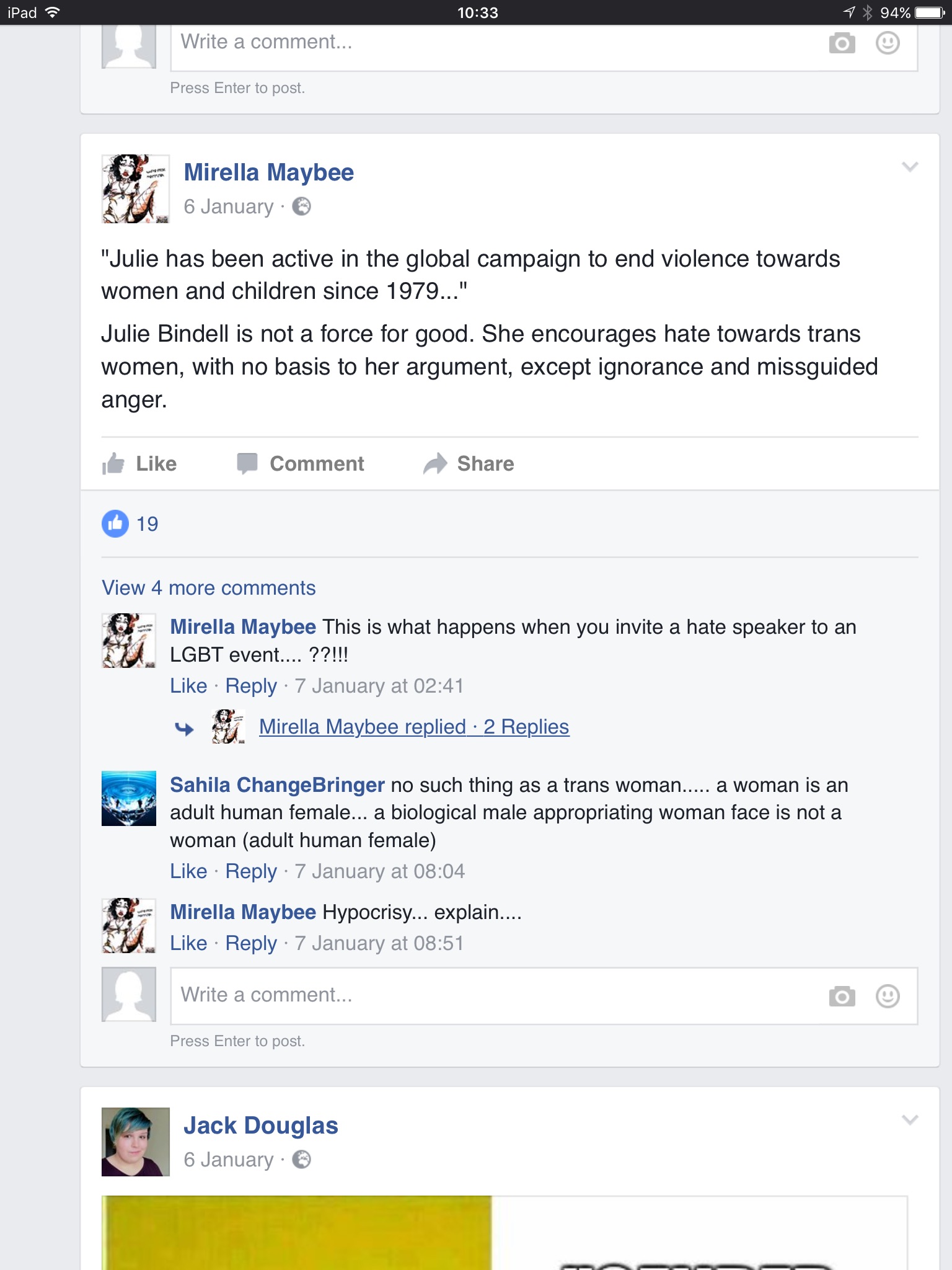 In case anyone thought after the events of Wednesday 13 September that abuse, violence and violent rhetoric were a new thing in transgender activism, here is a collection of violent and abusive receipts collected in the build up to Julie Bindel’s talk on growing up as a working-class lesbian, given at Salford’s Working Class Movement Library in February 2017. Much of this material was taken from the talk’s event page on Facebook.